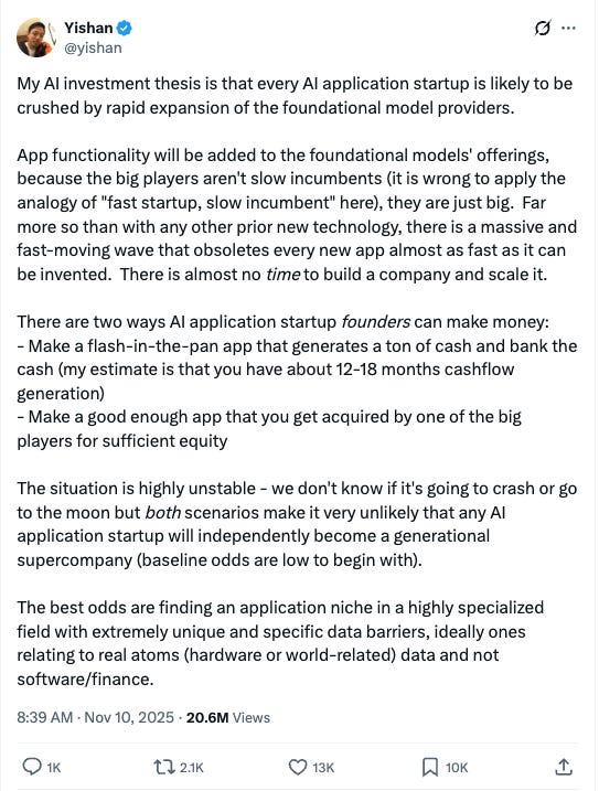 There’s a lot of lore about 996 in the AI era. Work from 9 am to 9 pm, six days a week. Seventy-two hours a week; 3,600 hours a year; 10,000 hours in three years. Sometimes working 996 adds up to generational wealth. Sometimes, it adds up to 0. If you work in tech, you know an entire rolodex of people, grinding hard, for the long term. You might want the best for some of them; some of them might be your friends. For many of them, it won’t work out. This part, their disappointment, yours, or somebody’s, is inevitable. Though it can’t be stopped, and their time cannot returned, that doesn’t mean nothing can be done. Because in the very long term, the memories matter more than success. So pay attention. Watch your friends work; see what they’re sacrificing. Call them, email them, and wish them a happy birthday. See, and show them what you see. Because when this bubble bursts, and people’s work gets erased and their hours wasted, all that remains is what other people witnessed. And it is on each of us to remember what they hope we do not forget.